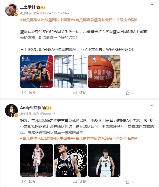 媒体人@Anay张泽欣和@三土带刺也有类似报道,其中前者表示曾凡博9月初和篮网会合随队训练,得到球队认可。