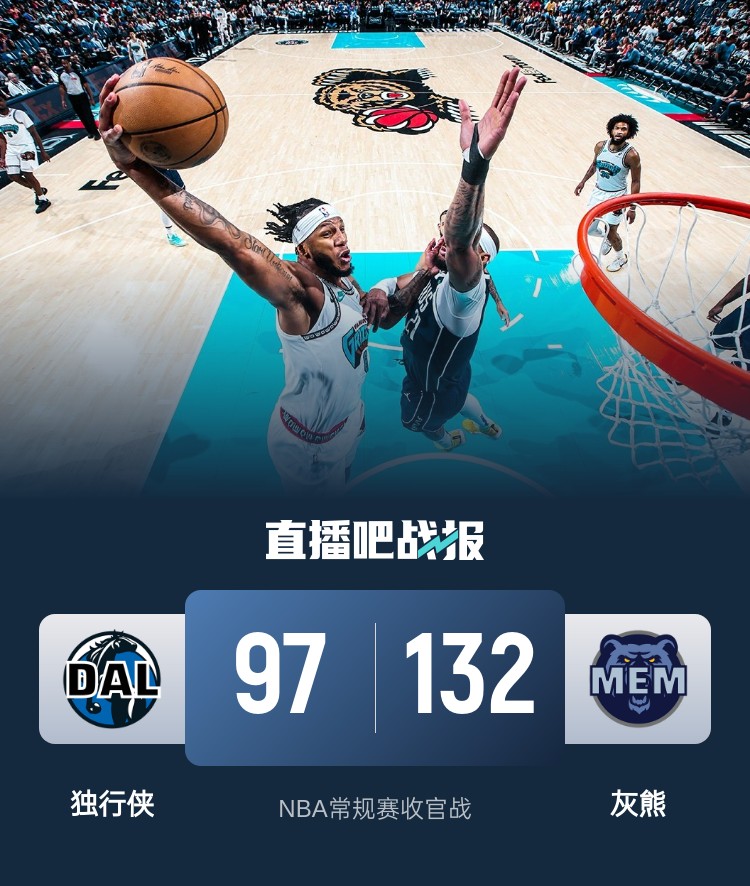 比赛开始,双方开场便陷入缠斗,独行侠冲击内线频频得手,灰熊内外开花迅速反超并确立两位数优势,次节灰熊持续发力一度将分差拉开到20分,克里斯蒂高效发挥带队追赶,半场战罢灰熊67-54领先独行侠。易边再战,灰熊占得先机再获20分优势,末节灰熊越战越勇不断扩大优势,最终,灰熊132-97大胜独行侠。