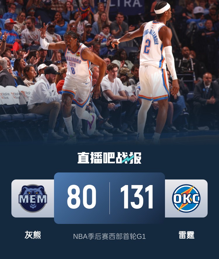比赛开始,双方开场短暂相持,比分咬得很紧,亚历山大表现慢热,但雷霆多点开花完成10-2的攻击波取得两位数优势,次节雷霆火力全开,攻防两端压制对手轰出26-4的进攻狂潮一举将分差拉开到30分以上,半场战罢雷霆68-36领先灰熊。易边再战,雷霆毫不手软,内外开花一波10-0继续扩大优势,灰熊无力招架,分差一度来到52分,巴格利弹无虚发苦苦支撑,末节雷霆稳扎稳打保持大比分的优势,分差最多曾来到56分。最终,雷霆131-80狂胜灰熊,大比分1-0取得领先。