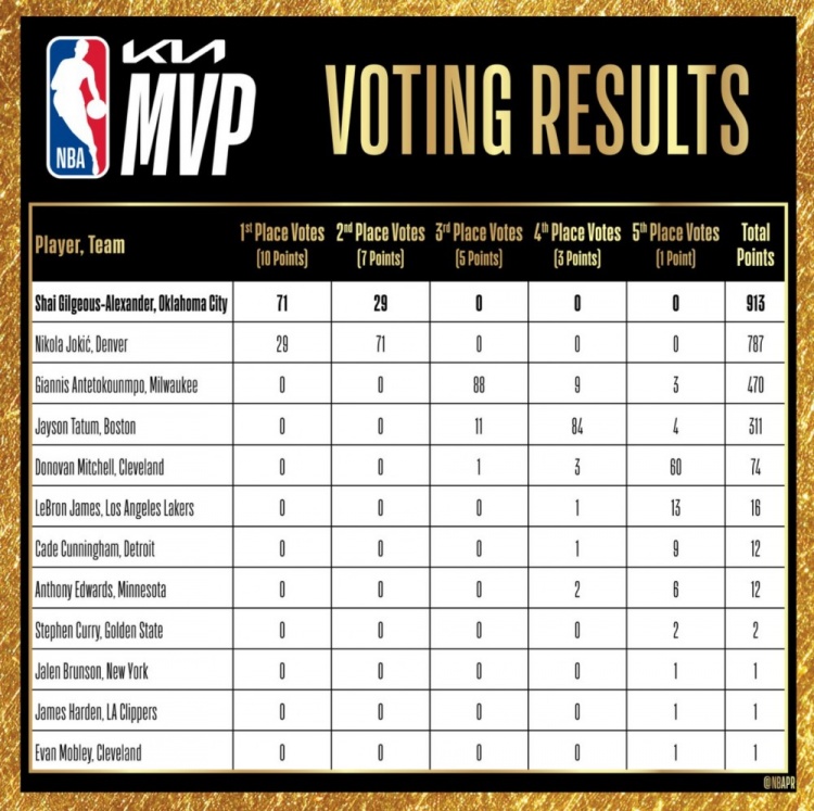 5月22日讯 此前,NBA官方宣布,雷霆球星亚历山大荣获本赛季MVP,投票详情如下: