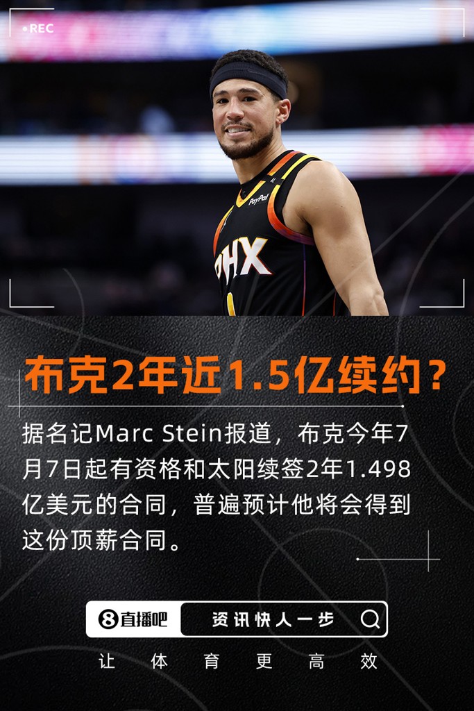 06月08日讯 据名记Marc Stein在专栏中透露,太阳球星德文-布克自7月7日起有资格获得一份2年1.498亿美元的提前续约合同,普遍预计这位28岁的后场球星将获得这份顶薪合同。