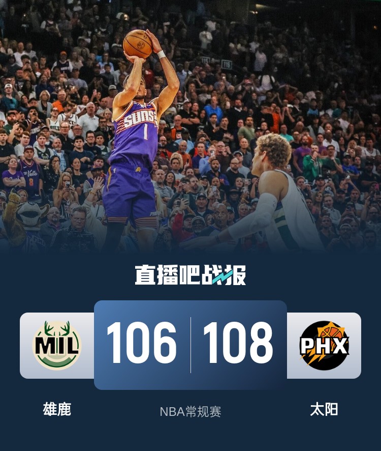 比赛开始,双方开场大打对攻,雄鹿内外开花,太阳不断冲击篮筐连投带罚给出回应,杜兰特和字母哥对飙,次节太阳先拿6分完成反超,此后双方展开拉锯战,比分交替领先,半场战罢雄鹿58-54领先太阳。易边再战,雄鹿命中率下降,太阳内外开花再度反超,末节杜兰特和邓恩联手拿分带队占据场上主动,雄鹿内外开花顽强咬住,关键时刻字母哥三分追平后两罚不中,雄鹿挑战成功拿到球权,双方争夺陷入白热化,库兹马打成3+1,杜兰特三分反超,大洛两罚一中后双方战平,布克中投准绝杀,最终,太阳108-106险胜雄鹿。