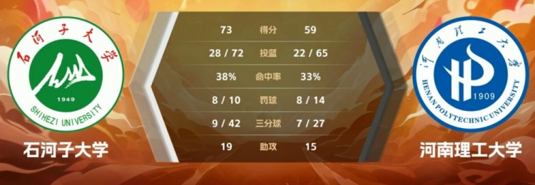 末节比赛,双方的得分都很困难,半节时间打出5-5的比分,不过石河子大学一直保持着十分以上的领先优势,河南理工没有获得任何机会,最终石河子大学73-59轻取河南理工。