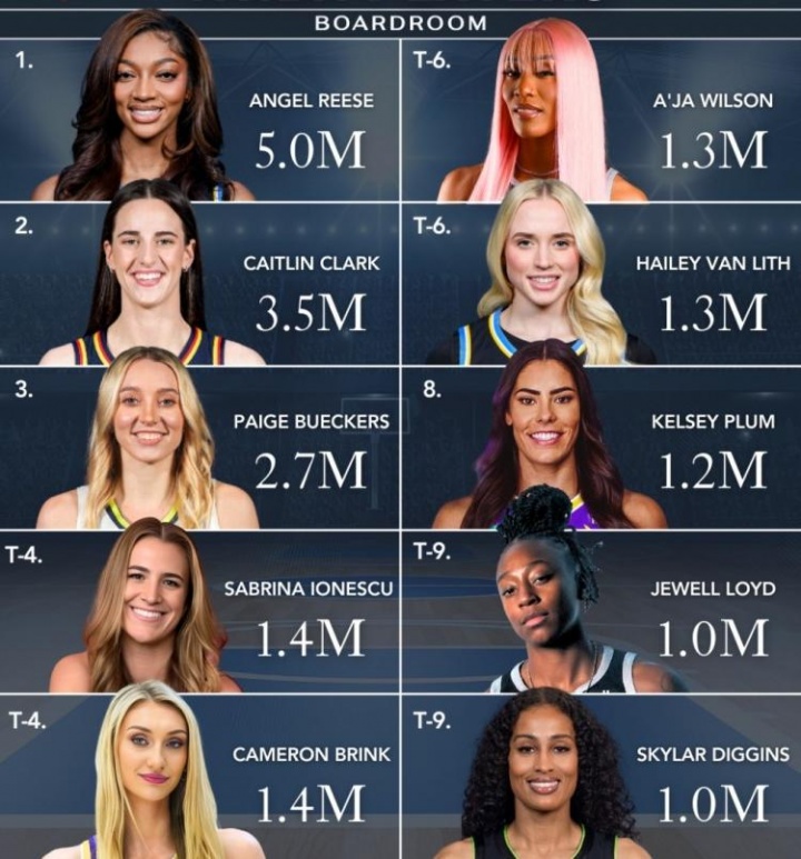 7月21日讯 美媒boardroom统计了WNBA球星的社媒粉丝数排行,并配文写到:一些女子篮球界的大牌球星正在Instagram上迅速积累超高人气。