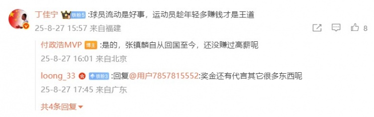 @丁佳宁 表示球员流动是好事,运动员趁年轻多赚钱才是王道。付政浩回复:“是的,张镇麟自从回国至今,还没赚过高薪呢。”