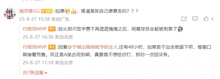 网友@海洋缘GG表示:“如愿,难道是张自己愿意走的???”付政浩回复:“自从那次签字费不再遮遮掩掩之后,明星球员全都被刺激了。”