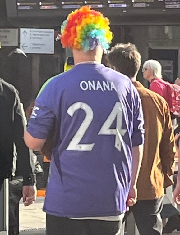 曼联本轮英超不敌布伦特福德,记者Samuel Luckhurst晒出一位球迷身穿奥纳纳球迷的照片,这位球迷还戴了一顶小丑的假发,该记者调侃道:可以肯定的是,这个小伙子不是奥纳纳的最大球迷。