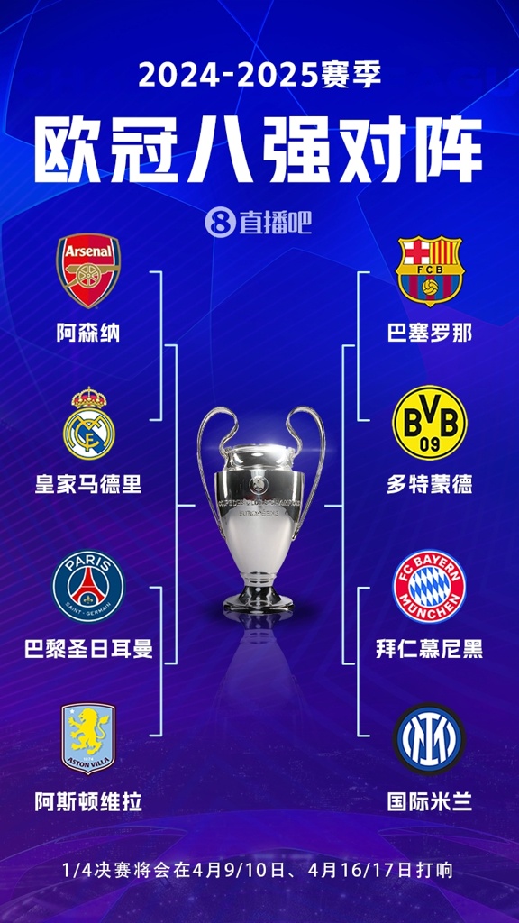 欧冠1/4决赛战火继续,明天凌晨3点,巴萨vs多特、巴黎vs维拉将同时开球。