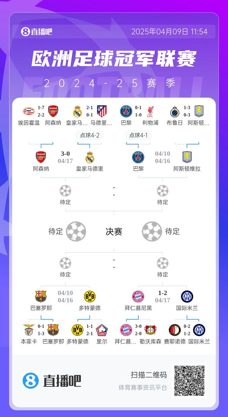 在先前进行的另外两场1/4决赛中,阿森纳3-0完胜皇马、拜仁1-2不敌国米,今天的两场比赛,谁将占得先机?