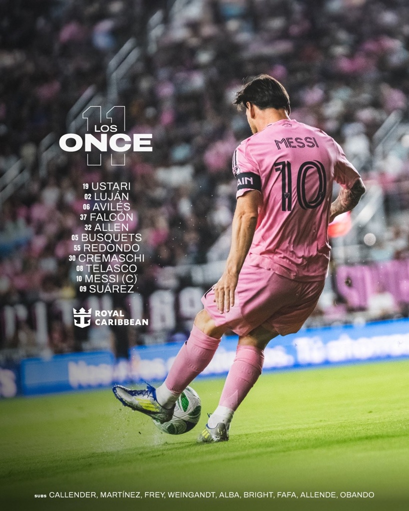 迈阿密国际首发:19-乌斯塔里、2-卢扬、6-阿维莱斯、37-法尔肯、32-阿伦、5-布斯克茨、55-雷东多、30-克雷马斯基、8-特拉斯科、10-梅西、9-苏亚雷斯