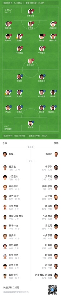 沙特替补:21-哈米德-尚基提、22-艾哈迈德-卡萨尔、3-萨阿德-穆萨、6-纳赛尔-多萨里、11-阿卜杜拉-哈姆丹、12-阿里-马加斯希、14-艾哈迈德-加姆迪、15-艾曼-叶海亚、18-穆哈纳德-萨阿德、19-图尔基-阿马尔、20-阿卜杜拉-萨利姆、23-齐亚德-乔汉尼