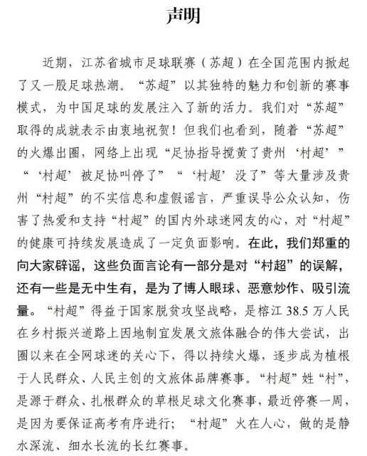 但我们也看到,随着“苏超”的火爆出圈,网络上出现“足协指导搅黄了贵州‘村超’”、“‘村超’被足协叫停了”、“‘村超’没了”等大量涉及贵州“村超”的不实信息和虚假谣言,严重误导公众认知,伤害了热爱和支持“村超”的国内外球迷网友的心,对“村超”的健康可持续发展造成了一定负面影响。