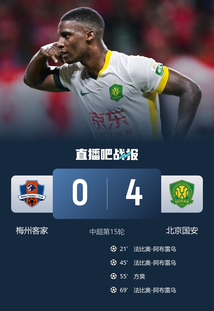 6月25日讯 北京时间6月25日19点35分,中超第15轮,梅州客家在主场五华奥体中心惠堂体育场迎战北京国安。上半场,法比奥梅开二度。下半场,曹永竞助攻方昊破门,法比奥完成帽子戏法。最终北京国安4-0大胜梅州客家。15轮联赛过后,北京国安积35分排在联赛榜首,梅州客家积12分排联赛第十四。