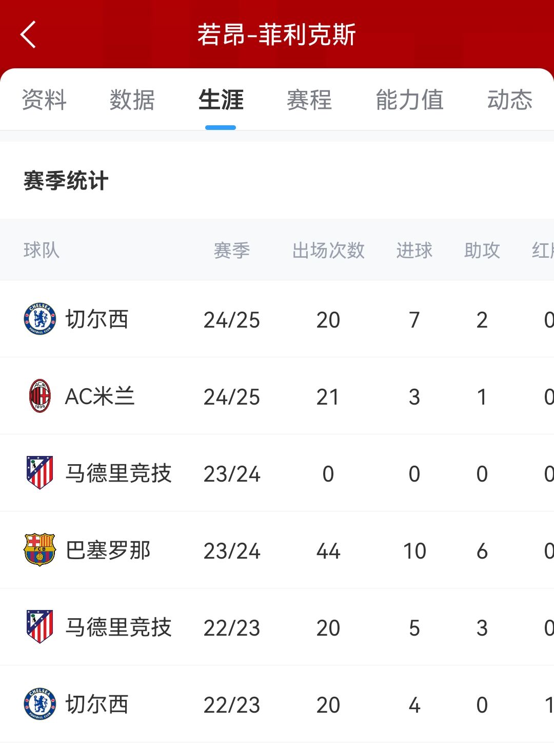 2023年1月,菲利克斯租借加盟切尔西,开启了自己的流浪生涯。两年间菲利克斯先后辗转马竞、巴萨、切尔西、AC米兰4支球队。