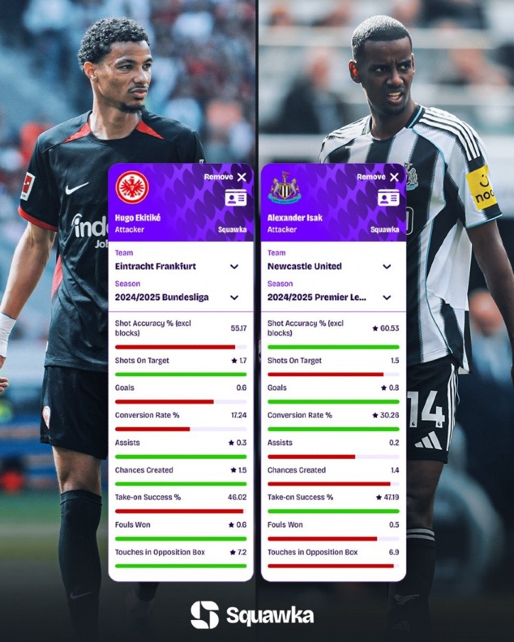 7月20日讯 埃基蒂克距离加盟利物浦已经无限接近,此前伊萨克也是红军追逐的对象。他们分别效力于英超和德甲,都是联赛的当红球星。Squawka将伊萨克和埃基蒂克两人的多项数据进行对比,究竟两人谁更胜一筹,谁才是真正的高级货?