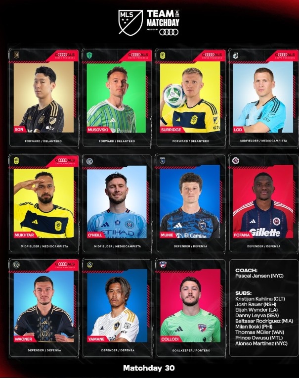 前锋:苏里奇(纳什维尔)、穆索夫斯基(西雅图海湾人)、孙兴慜(洛杉矶FC)