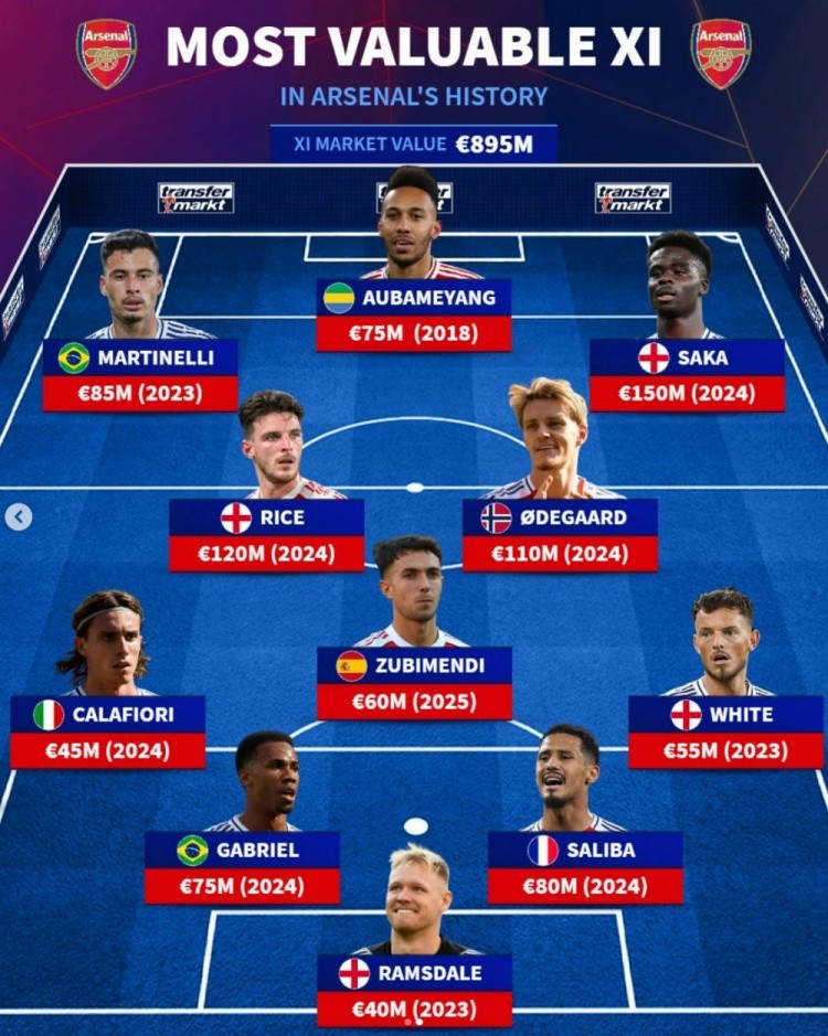 8月31日讯 本轮英超将迎来利物浦与阿森纳的焦点对决,德转也盘点了两支球队队史身价最贵阵容,具体如下: